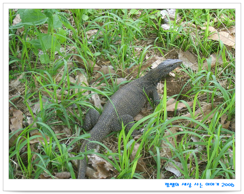 2006년 8월 8일, 말레이시아의 티오만 섬에서 만나본 거대한 왕도마뱀이야. 길이가 1미터가 넘는 왕도마뱀 서너 마리를 숲에서 만난다면 느낌이 어떻겠어? 그런데 라부안바조 항구와 가까운 코모도 섬에 3미터가 넘는 거대한 왕도마뱀이 살고 있다는 거야. 침을 질질 흘리며... 난 그게 싫어서 투어에 안 따라갔던 거야. 저런 거대한 녀석이 바다를 헤엄쳐 가는 걸 본 적이 있어.